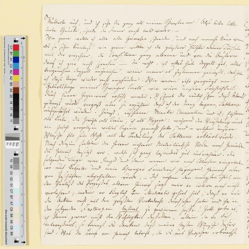 Du bist doch Helmines Mutterle auch, und ich sehe sie ganz als meine Schwester an! Also bitte bitte liebe Schnucke, schicke die Imme recht bald wieder.- Wie gern wollte ich alle alte Grimaßen schneiden, und noch manche Neue wenn du sie sehen könntest! wie gern wollte ich die größere Hälfte deiner Trüffeln mit dir verspeisen, die Confiture ganz alleine und von die Austern darf ich gar nicht sprechen -- Ja wohl, ist alles Gute doppelt gut, alles Angenehme doppelt angenehm, wenn mann es zusammen genießt, das habe ich diese Tage wieder recht empfunden., Besuch von Kospoths und Baron Reibnitz, Dank für die Handschuhe, ich habe geweint wie ich sie sah.